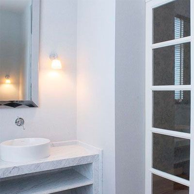 De berømte Cube-lampene fra Fabbian er en klassiker på badet.