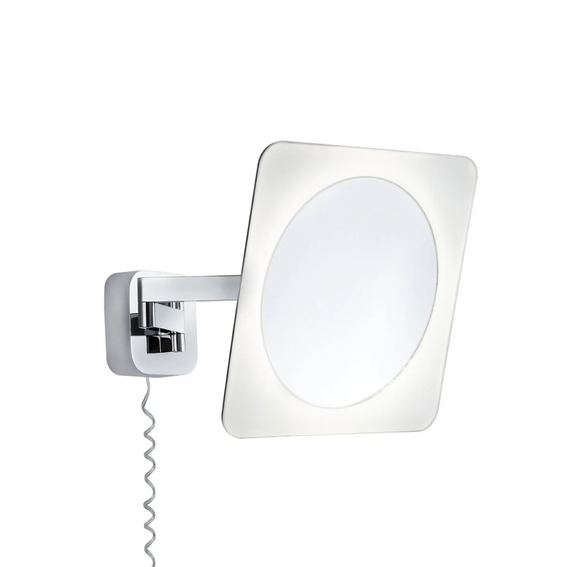 Bela LED Vanity Mirror w/Lamp IP44 Chrome/White/Mirror fra Paulmann er den perfekte kombinasjonen av funksjonalitet og stil for badet eller sminkebordet ditt. Denne vegglampe med speil er utviklet for å dekke dine daglige behov, enten det er barbering eller sminking. Takket være det raffinerte, sammenleggbare designet kan du enkelt justere speilet etter dine ønsker, og når du er ferdig, kan det foldes tilbake på veggen for å spare plass. Bela er laget av slitesterkt metall og akryl, og den elegante finishen i krom og hvitt passer perfekt i moderne interiører. Speilet er utstyrt med en integrert LED-lyskilde som ikke bare gir et sterkt lys, men også er energieffektiv og reduserer energiforbruket med opptil 80 % sammenlignet med tradisjonelle glødepærer. Med kapslingsgrad IP44 er lampen sprutvannssikker og ideell for bruk i fuktige rom. Den innebygde 3-doble forstørrelseseffekten gjør det enkelt å se selv de minste detaljene.