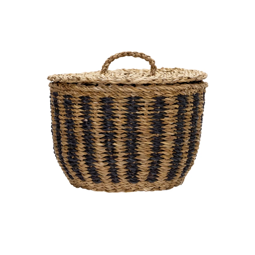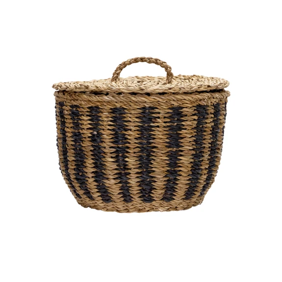 Naturlig stil i fokus: Dette håndflettede settet med tre sjøgresskurver med praktiske lokk begeistrer med grafiske mønstre i naturfarger og svart. Hver kurv er unik og gir hjemmet ditt varme og et moderne bohem-preg. Oppbevar leker, tekstiler eller småting fra hverdagen på en beskyttet måte – med skiftende favorittmønstre etter humør og smak. Enten som blikkfang i gangen, som skattekiste på barnerommet eller som stilfull dekorasjon i stuen: Disse kurvene gjør oppbevaring til et designuttrykk.