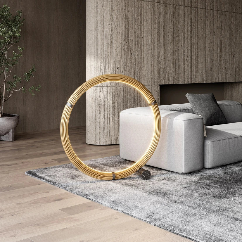 Elli Floor Lamp Gold er innbegrepet av en elegant og estetisk belysningsmodell. Med sitt konsekvente design, helhetlige formspråk og vakre visuelle kvaliteter beriker Elli ethvert rom og interiør med et sofistikert uttrykk. Lampen er en del av Elli-serien, som består av en pendel og en gulvlampe. Hver modell er tilgjengelig i to fargevarianter, matt svart og skinnende gull. Felles for dem begge er det ringformede lampehodet og den vakre rillestrukturen som gjentar lampens grunnform om og om igjen. Den ene siden av lampen er utstyrt med LED-belysning som går langs hele lampehodet og skaper en ring av lys hver gang lampen slås på.
