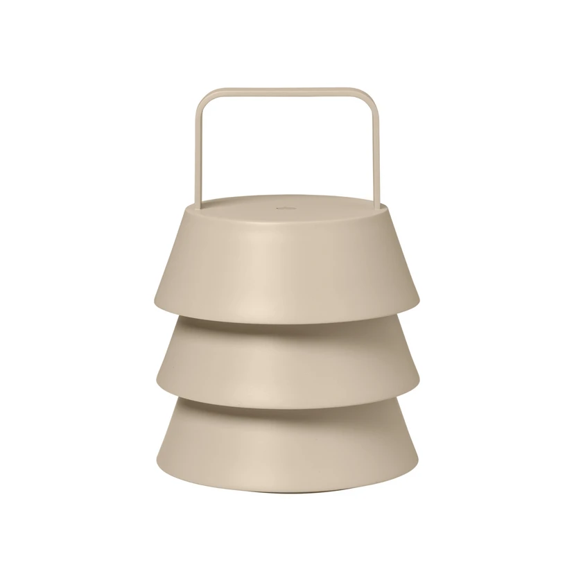 Luver bærbar lampe i pulverlakkert jern kombinerer eleganse og bærbarhet. Den stablede konstruksjonen med tre spisse lampeskjermer fremhever lampens presise håndverk. Vinkelen på lampeskjermene sprer lyset og skaper en koselig atmosfære. Den har en dimmerfunksjon og tre lysinnstillinger, og er egnet både for innendørs bruk og, ved tørt vær, også for utendørs bruk. Denne allsidige lampen gir varme og eleganse til alle typer rom.