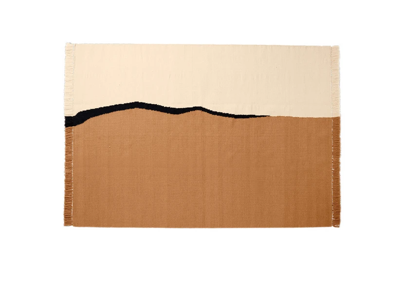 Soil Kelim Rug 170x240 Dark Sand/Off-white fra Ferm Living er det perfekte teppet for deg som ønsker å tilføre hjemmet ditt et snev av naturlig eleganse. Inspirert av geologiens komplekse formasjoner har dette teppet, som også kan beskrives som et kunstverk for gulvet, et trefarget design i beige, svart og oransje. De forskjøvne og uregelmessige stripene skaper en visuell attraksjon som fanger blikket. Teppet er laget av 80 % ull og 20 % bomull, og kombinerer myk ull fra New Zealand med slitesterk bomull for en luksuriøs og behagelig følelse under føttene. De håndvevde detaljene og de 7 cm lange frynsene gir teppet en beroligende, taktil dimensjon som gjør det til et ideelt tilskudd til alle rom der du ønsker å skape en varm og innbydende atmosfære. Gi hjemmet ditt et unikt preg med dette vakre teppet.