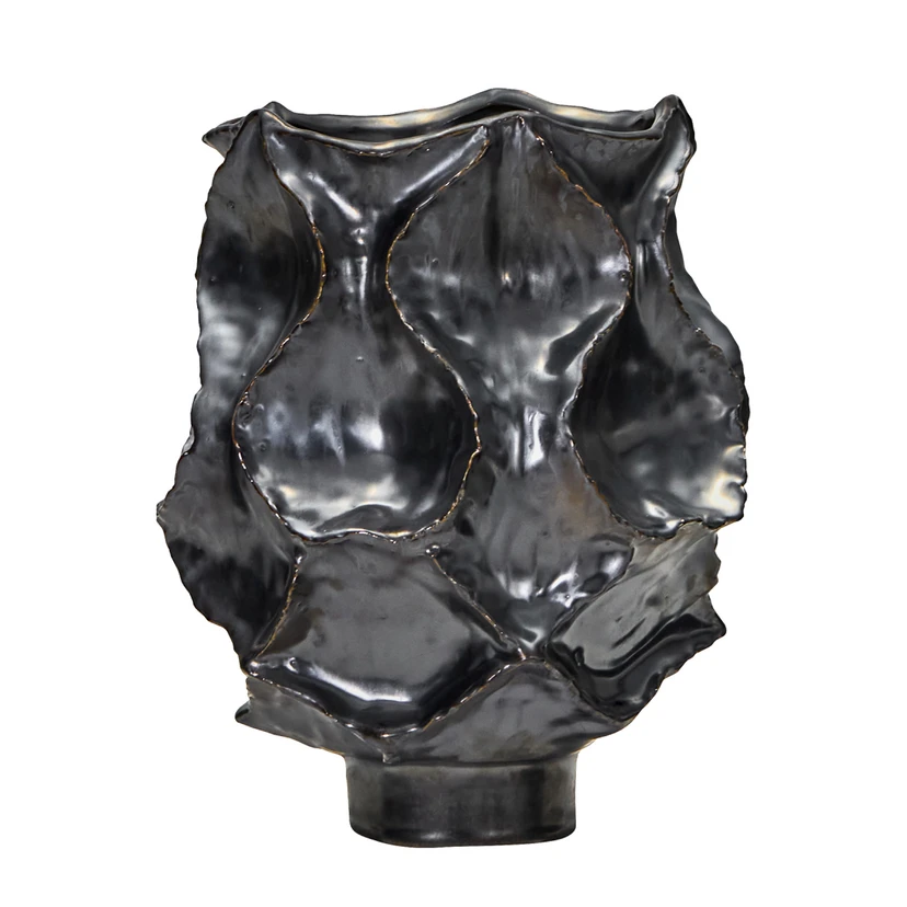 Vasen Waves kombinerer rustikk sjarm med tidløs eleganse. Den er laget av høykvalitets stein og imponerer med sin robuste utførelse og unike, metalliske antikke farger. Den bølgete strukturen gir designet en spesiell dynamikk og gjør vasen til et blikkfang i ethvert rom.